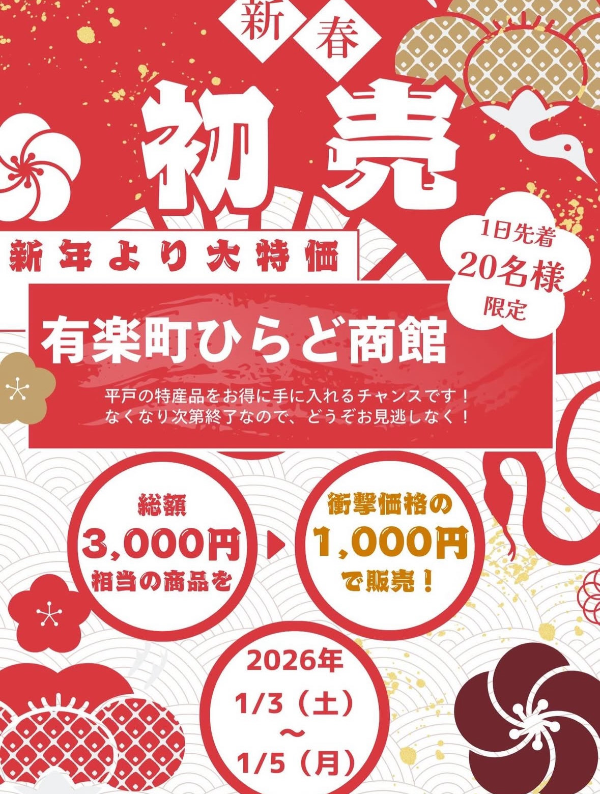 1月3日(土)から5日(月)の3に日間で1日あたり先着20名限定となっていますのでお早めにお越し下さい。