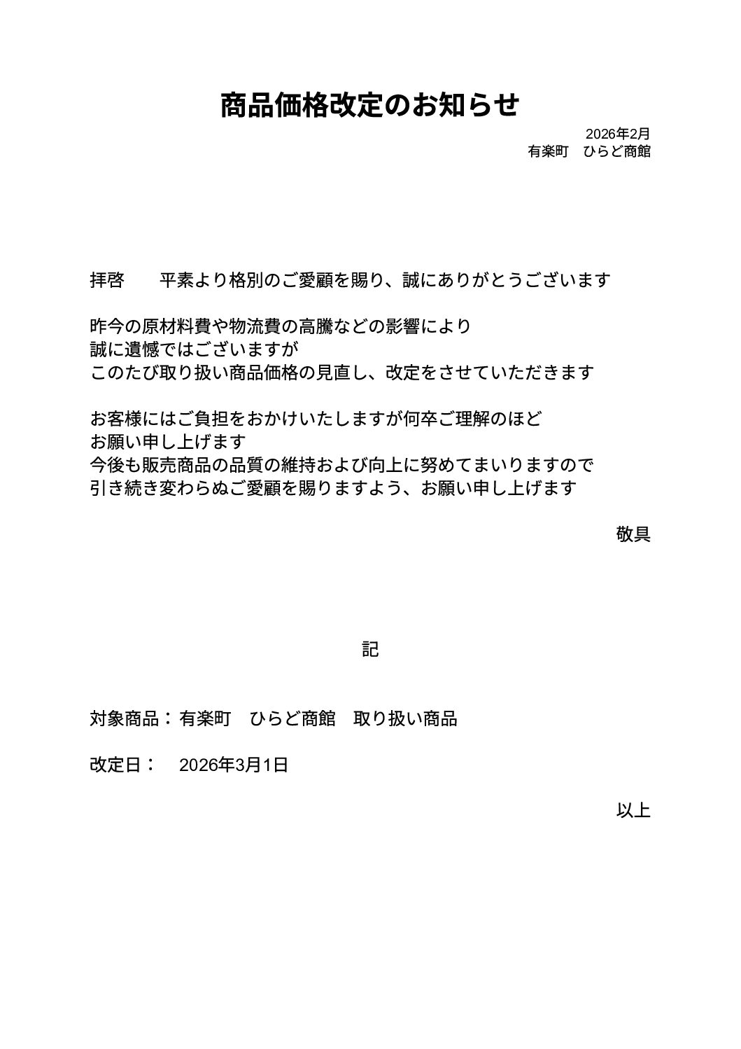 このたび取り扱い商品価格の見直し、改定をさせていただきます